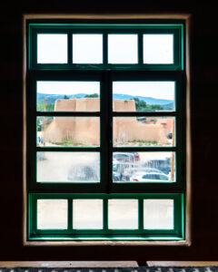 A window view of the San Francisco de Asís Church in Ranchos de Taos, as seen across the street from the Old Martinez Hall